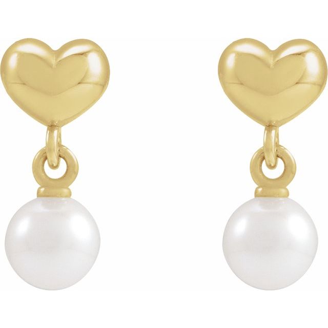 14K Cultured Freshwater Pearl & Heart Dangle Earrings - 14K Yellow