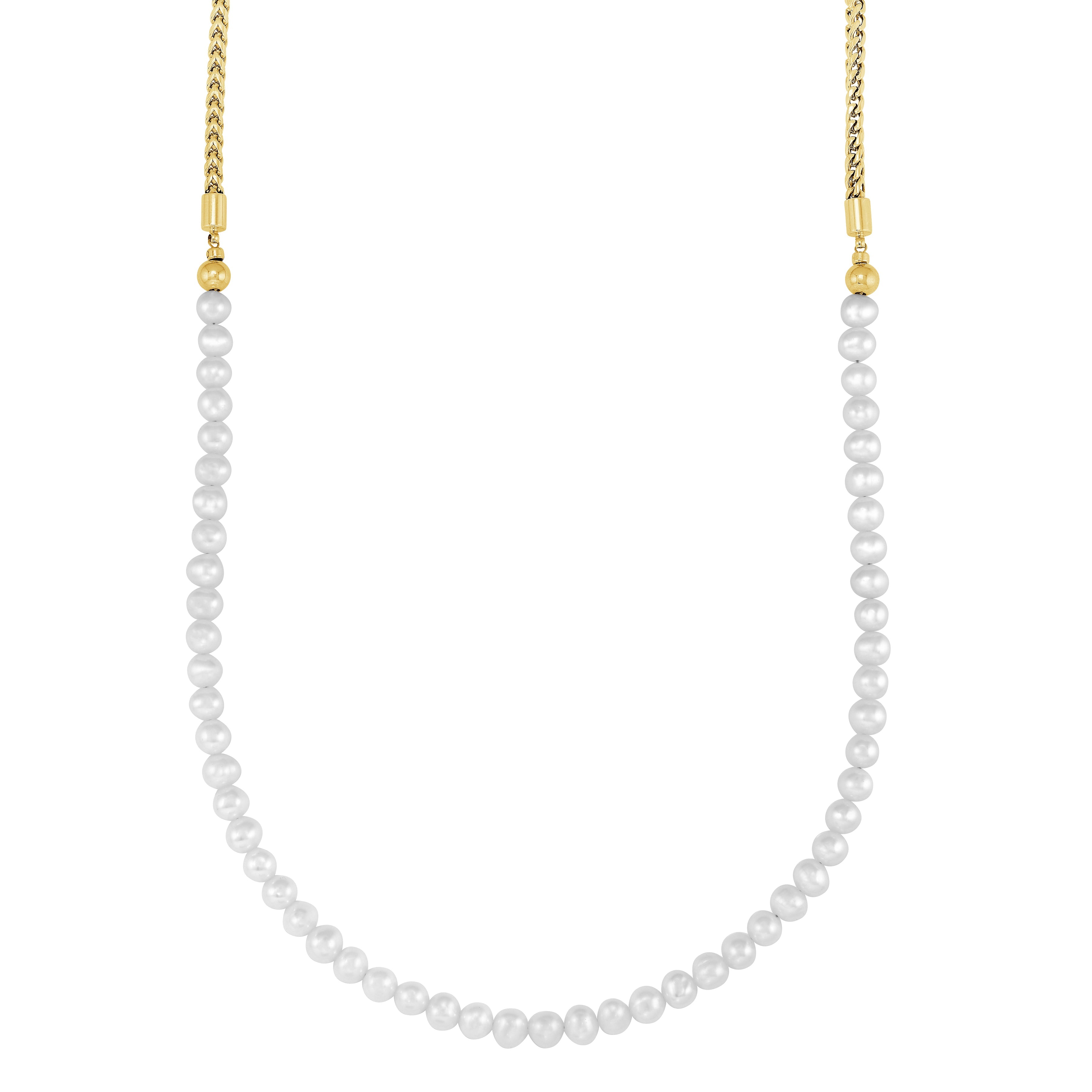 This 3.5MM FRANCO NECKLACE sparkles with 6MM FRESHWATER PEARLS coated with luxurious 14K gold ion plating. Perfect for any outfit, this timeless accessory will shine for years to come.