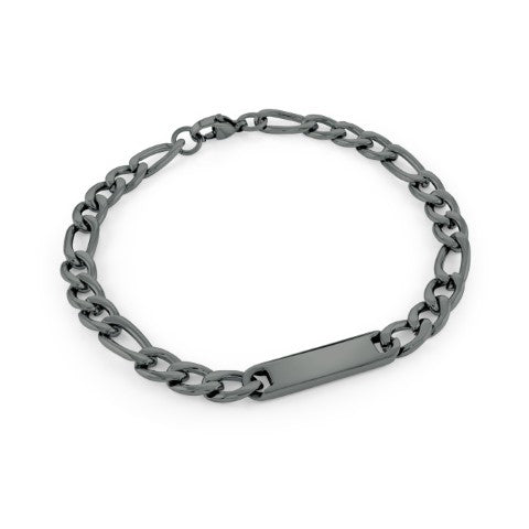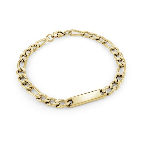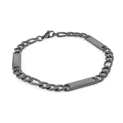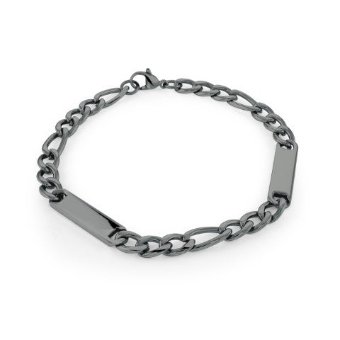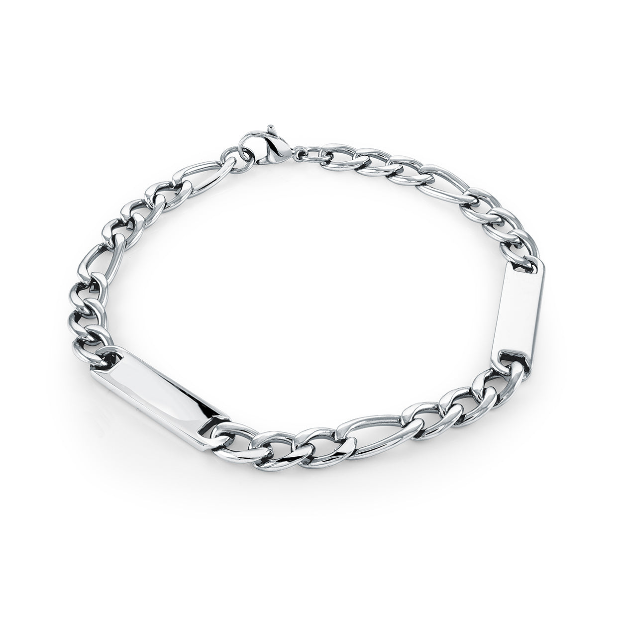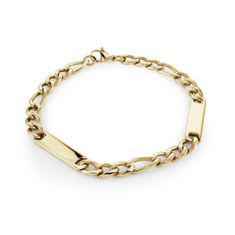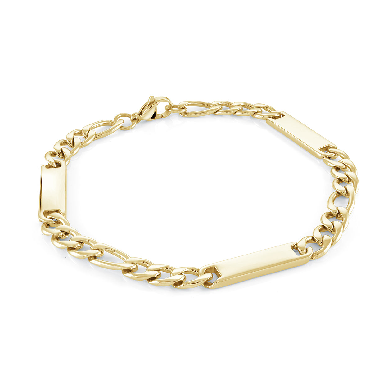Expertly crafted with a 6mm width, this figaro bracelet provides a sleek and sophisticated look. With 1 to 3 engraveable plates, add a personalized touch and make it your own. The perfect accessory for any occasion.